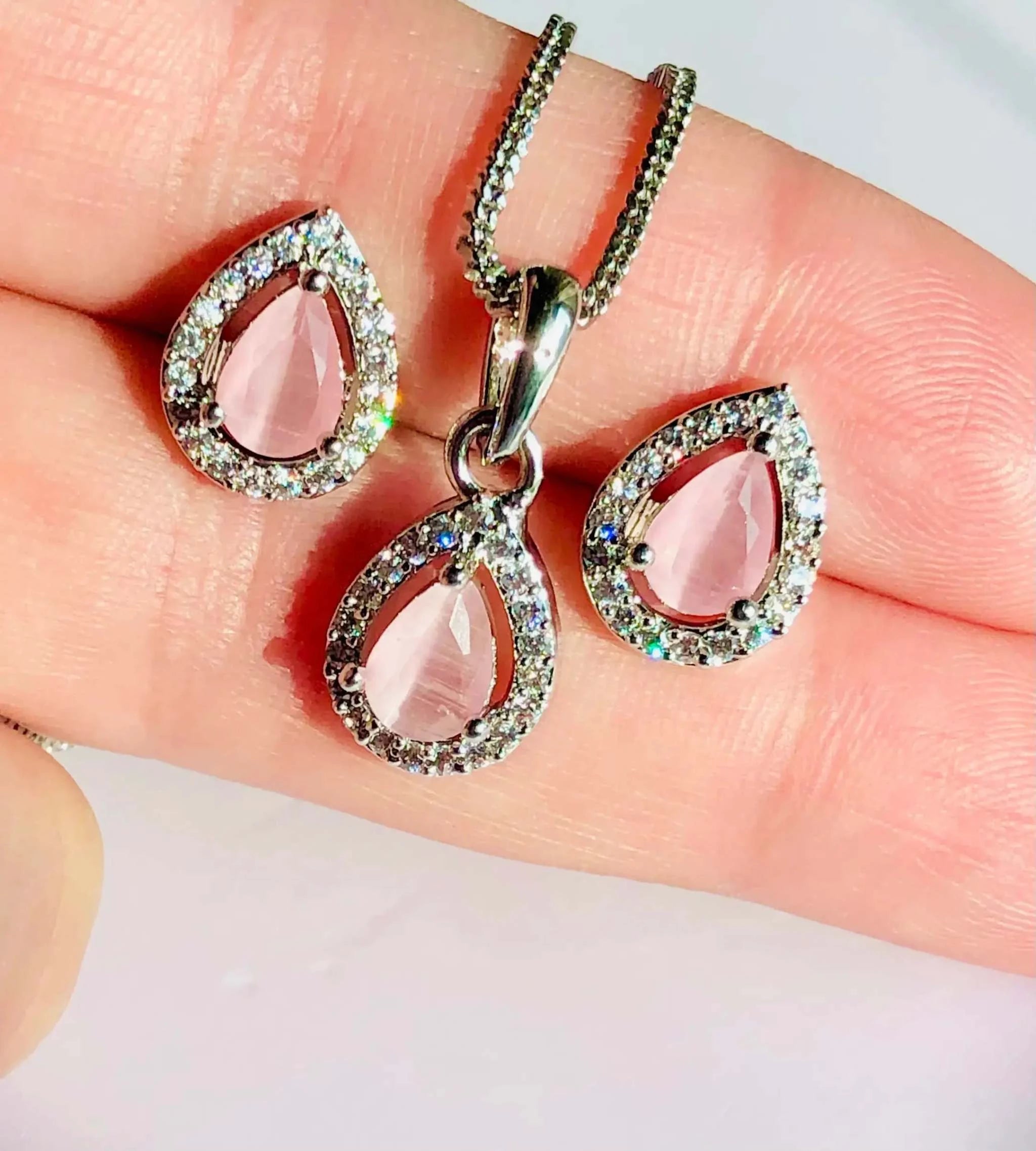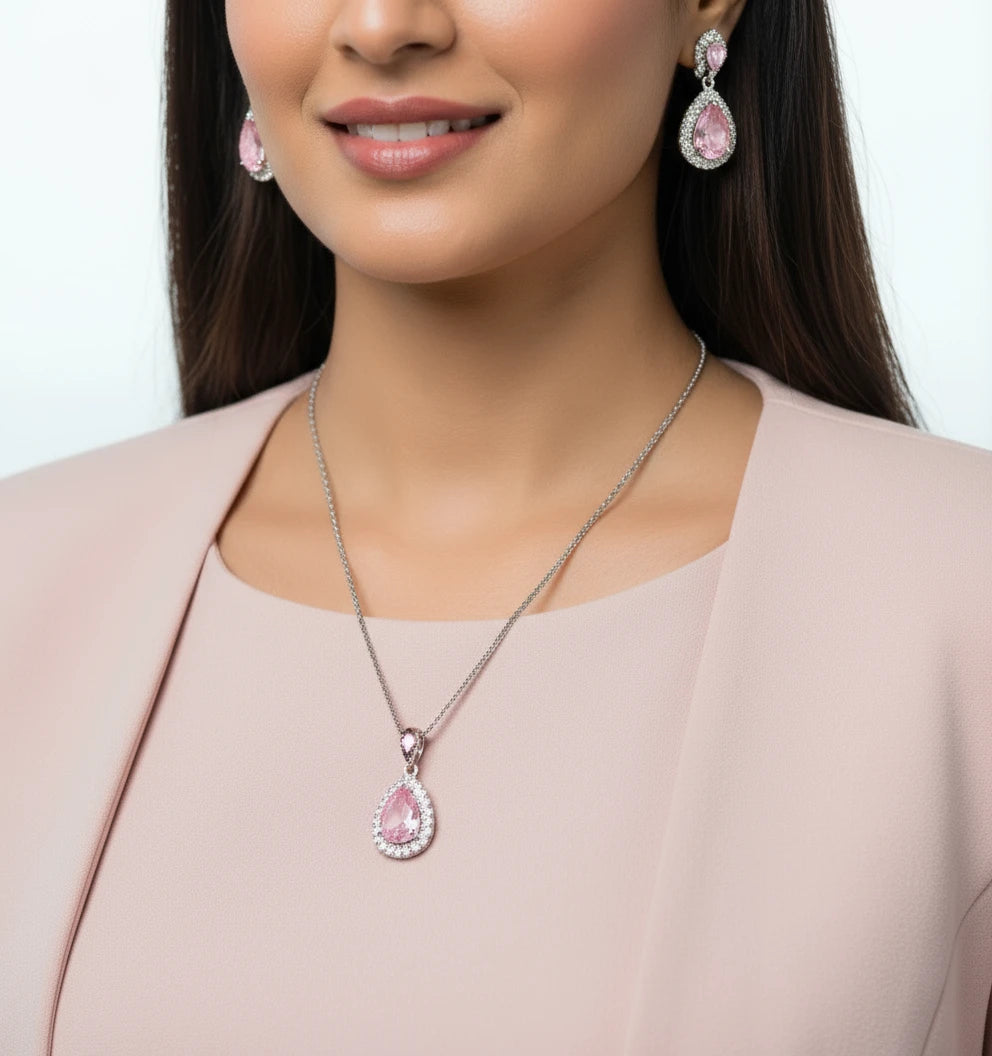 Unveil the charm of our stunning teardrop pendant set, featuring soft pink tones paired with radiant silver accents. This elegant accessory is perfect for special occasions or casual outings, adding sophistication to any look. Embrace timeless beauty with this exquisite piece.