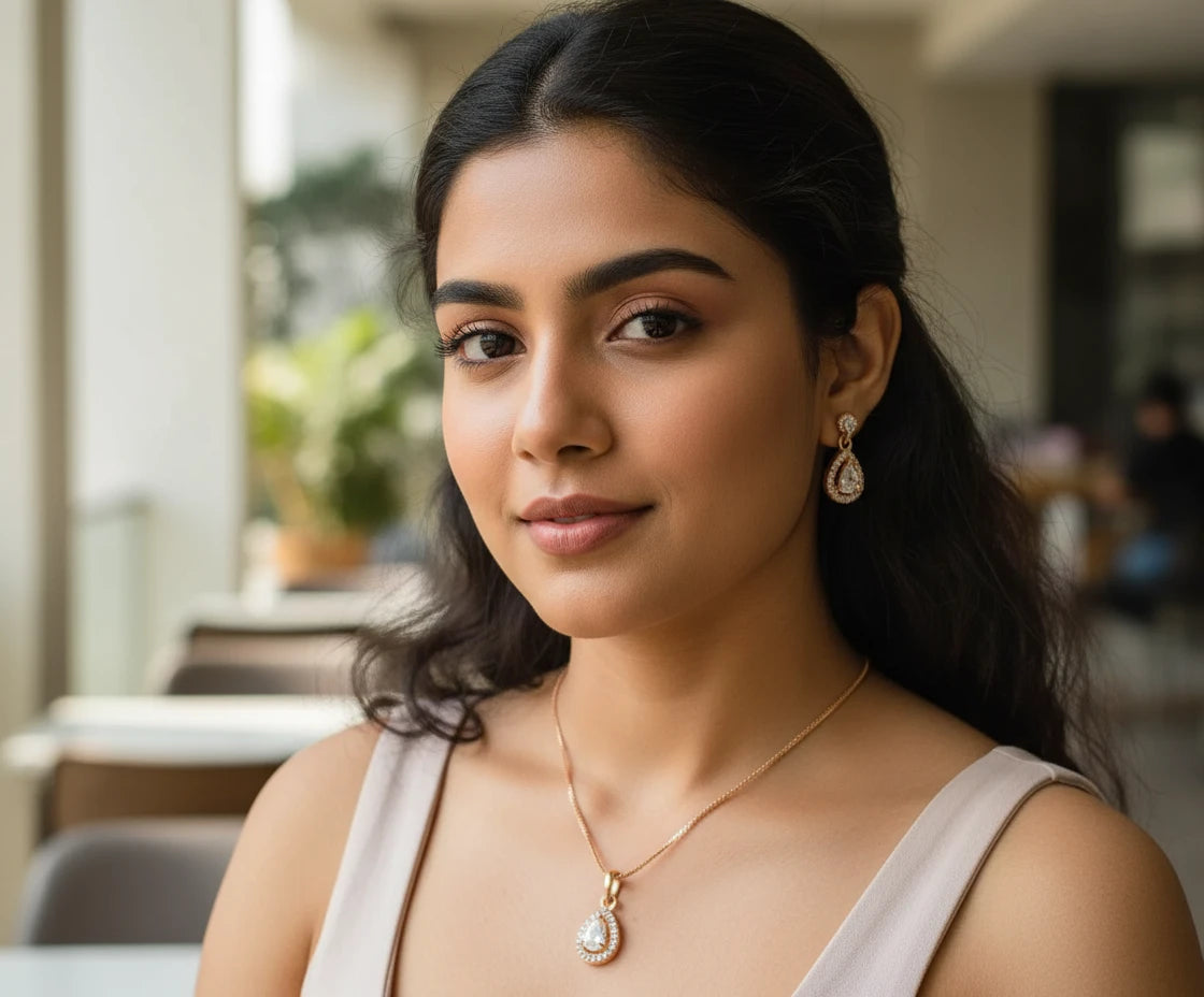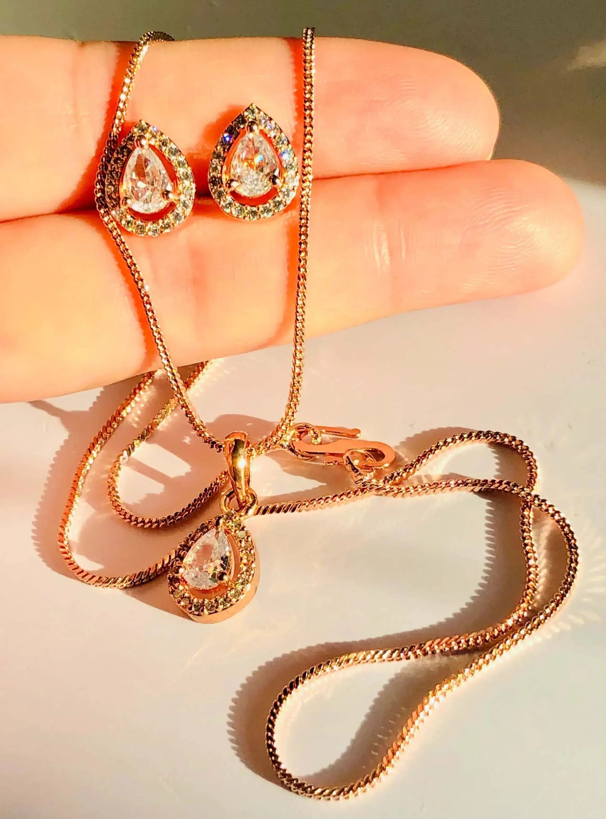 Embrace elegance with our stunning teardrop pendant set, beautifully crafted in rose gold and embellished with sparkling white gemstones. This eye-catching piece is perfect for enhancing any outfit, making it ideal for both special occasions and everyday wear.