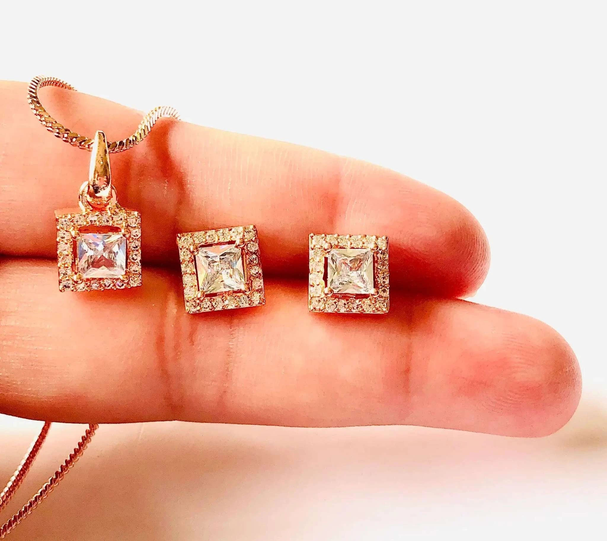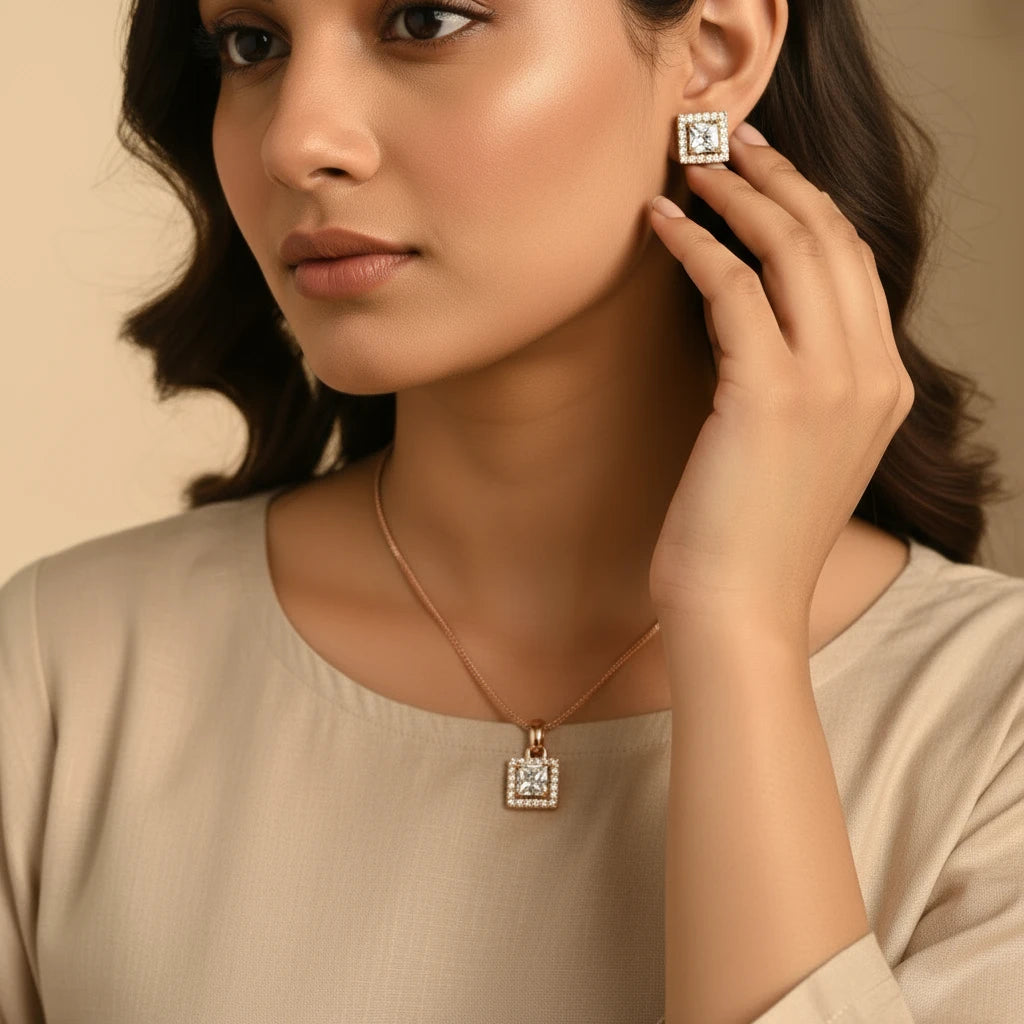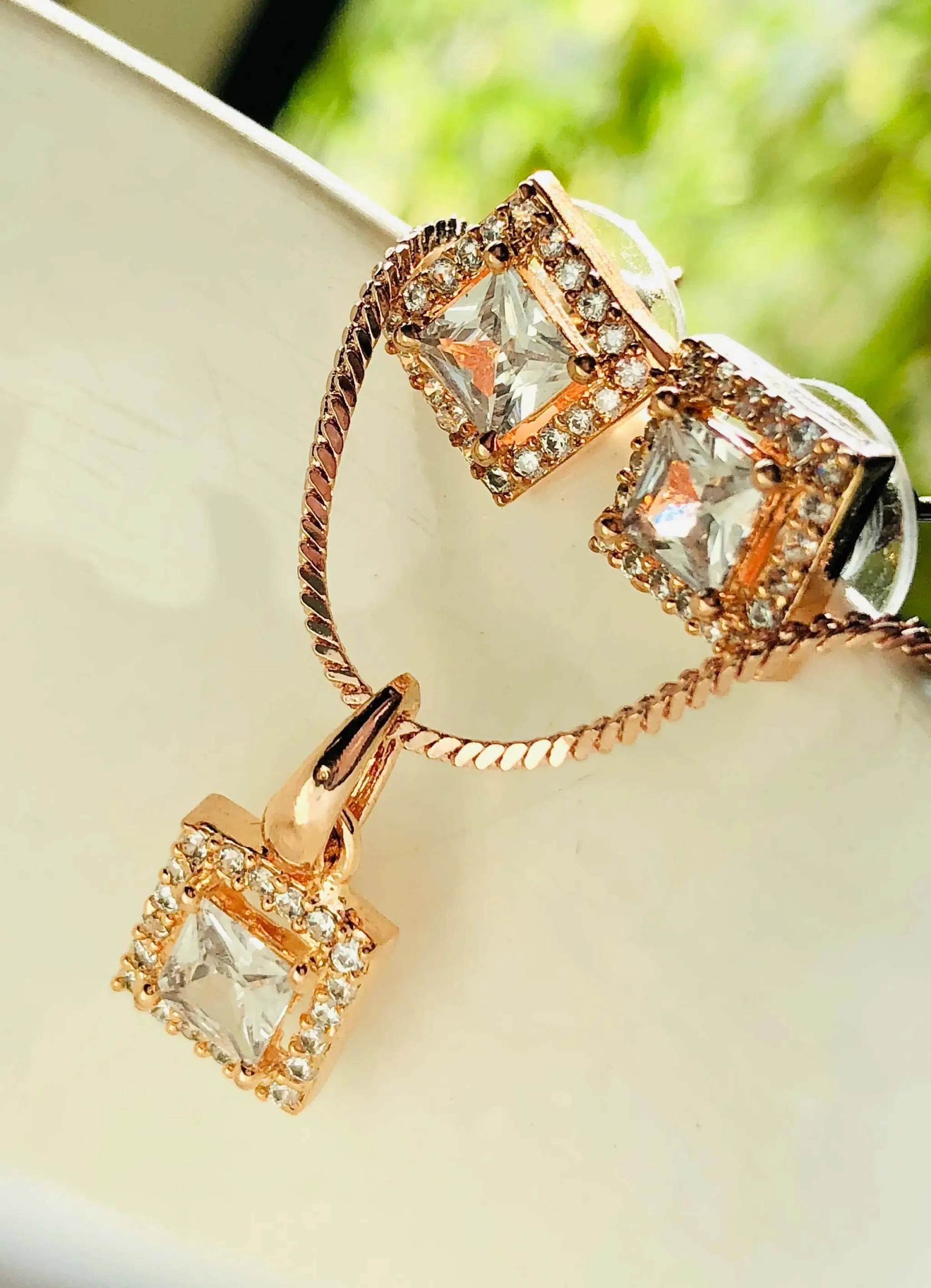 Embrace the captivating elegance of this rose gold pendant set, adorned with sparkling white gemstones that enhance your outfits with a luxurious flair. It promises durability while serving as a stunning accessory for special occasions or gifts.