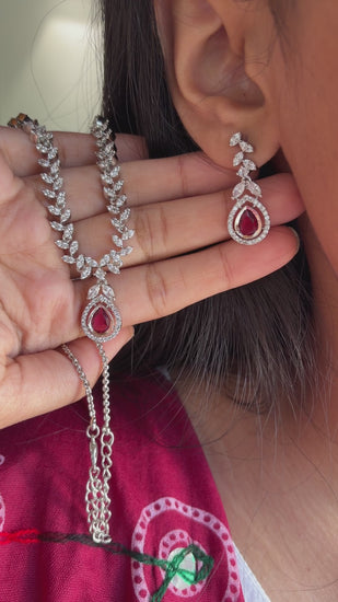Scarlet Dew Necklace Set in silver blends bold scarlet accents with a sleek, luminous finish. Dew drop inspired elements shimmer gracefully, creating striking contrast and refined elegance. Perfect for festive moments or evening glamour, it adds a touch of romance, sophistication, and timeless charm to elevate every outfit beautifully.